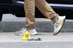 A little more than an hour later, investigators were setting evidence cones near empty shell casings, a pair of shoes, and a handgun that lay near a minivan with a flat tire. Others were using cellphones to take photographs through the windows of a car.