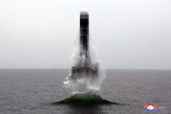 The KCNA report didn’t elaborate on whether the missile was fired from a submarine, a barge or other underwater launch platform. North Korea-dispatched photos showed the missile rising and spewing bright flames above a cloud of smoke from the sea, but the launch platform was not identifiable.