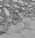 Researchers said the dunes appear to be made mostly of icy specks of methane the size of sand, with some frozen nitrogen likely mixed in. Thought to be relatively recent, the parallel rows of dunes are located in Pluto's heart-shaped region at the base of mountains as tall as the Alps and formed from giant blocks of ice with frosty methane snowcaps. These plains in the left lobe of Pluto's "heart" are known as Sputnik Planitia.