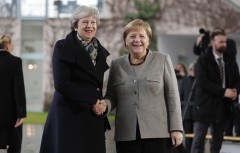 Merkel and May made no comment as they went into their meeting, and no statements or news conference were planned afterward. May, who started her tour in The Hague earlier Tuesday, was due in Brussels later in the day.