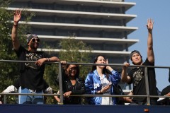 Earlier, manager Dave Roberts hoisted the trophy while aboard one of several buses that traversed a route packed with cheering, flag-waving blue-clad fans. “B 2 B” read one of many hand-lettered signs held up.