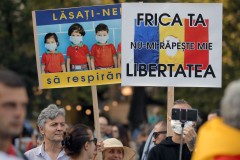 Protesters in Bucharest’s University Square drew parallels between the protective measures against the pandemic and Nazi regimes. One of the speakers compared the measures to the torture of dissidents during communism.