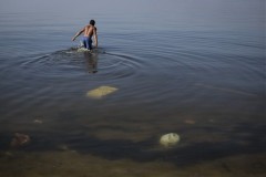 The visible problem involves old couches, tires and dead animals floating in the 148-square mile (383-square kilometer) bay. State officials are using garbage boats to collect floating debris, with the detritus weaving giant blankets of human and industrial waste along noxious shorelines.