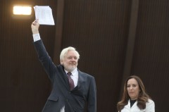 A group of supporters, holding a banner that said "Thank you, Julian" greeted Assange as he stepped out of a van smiling and raising his fist in defiance along with his wife, Stella, and WikiLeaks editor-in-chief, Kristinn Hrafnsson.