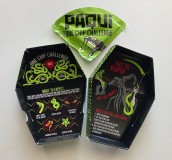 The One Chip Challenge chip sells for about $10 and comes wrapped in a sealed foil pouch that is enclosed in a coffin-shaped cardboard box. The package warns that the chip is made for the “vengeful pleasure of intense heat and pain,” is intended for adults and should be kept out of reach of children.