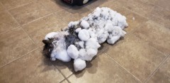 The owners came home early last Thursday to find that Fluffy had been crusted onto a hard-packed snowbank, as though she'd been sitting in one spot for a long time while the blowing snow drifted up around her, Clark said.