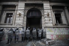 Video on social media showed flames shooting out a window in the legislative building. According to media reports, security agents fired tear gas at protestors and there were people injured.