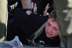 Just moments before the clash, demonstrators were singing and chanting. Around 10 a.m., a large group, knowing they were going to be arrested, allegedly crossed the protest barrier and attempted to walk up toward the U.S. Immigration and Customs Enforcement facility.