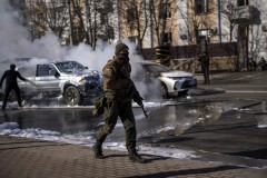Videos posted on Ukrainian media and social networks showed Russian vehicles moving across Kharkiv and Russian troops roaming the city in small groups. One showed Ukrainian troops firing at the Russians and damaged Russian light utility vehicles abandoned nearby.