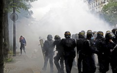 As marchers headed eastward and some pelted police with objects, police fired tear gas into the crowds, plumes of smoke filling the sky. A male protester was seen with a bleeding head and a police officer was carried away by colleagues. Three officers were injured, the French press quoted police as saying. Police, again responding to rowdy crowds, also turned a water cannon on protesters as the march ended at the Bastille.