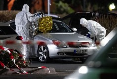 Police officers swarmed central Hanau, cordoning off the area of one of the shootings as a helicopter hovered overhead. A car covered in thermal foil also could be seen, with shattered glass next to it. Forensic experts in white overalls collected evidence.