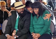 Michael Brown Sr., left, and his wife, Calvina Brown, right, are embraced by Trina Moorehead, of Florissant, upon their arrival at the Flood Christian Church service that was held in a tent on Sunday, Nov. 30, 2014, in Country Club Hills, Mo. The church was among dozens of businesses damaged or destroyed...   (Associated Press)