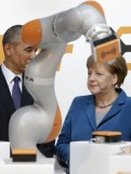 Obama and his host, German Chancellor Angela Merkel, are checking out high-tech inventions and chatting with developers at the massive industrial technology trade show.
