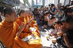 On Wednesday morning, a stream of people arrived at the Erawan Shrine, kneeling in prayer, lighting incense and placing flowers at the site where 36 hours earlier an explosion scattered body parts across one of the capital's busiest intersections. Buddhist monks in saffron robes joined members of the public to chant prayers at the popular Hindu shrine.
