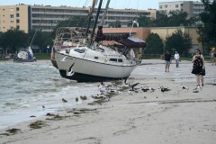 Several sailboats broke free from their moorings and washed ashore in Gulfport, Florida, including the vessel where Mo Taggart has lived for two years with her dog. She thinks the boat is a total loss.