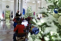 The decor features a gigantic gingerbread White House that recognizes front-line workers who persevered through the coronavirus pandemic, while the official Christmas tree — an 18-foot-tall (5.5-meter tall) Fraser fir — celebrates the gifts of peace and unity, the White House said.