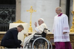 Seated under a canopy outside St. Peter’s Basilica, Francis led the ceremony, which was punctuated by booms of thunder, flashes of lightning and pouring rain, prompting cardinals, bishops, the choir and thousands of rank-and-file faithful in the square to open umbrellas.