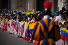 Thousands of jubilant Venezuelans filled the square and draped Venezuelan flags on its police barricades, adding splashes of red, blue and yellow that perfectly matched the uniforms of the attending Swiss Guards.