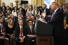 As Trump spoke, the White House East Room was packed with hundreds of supporters. Among them: Republican senators who voted to acquit him, Cabinet members and staunch House allies.