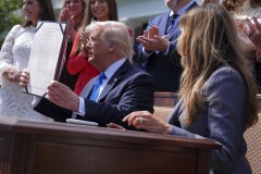 After she added her signature, the president held up the document to show both of their names to the audience at the ceremony in the White House Rose Garden. Melania Trump's signature is merely symbolic since first ladies are not elected and they play no role in the enactment of legislation.