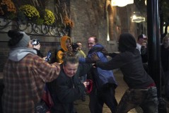 Protesters converged on Target Center, Minneapolis' basketball arena, hours before Trump's appearance, eventually packing the streets surrounding it. Many blew brightly colored whistles handed out by fellow protesters, adding to the din of frequent chants like, "Lock him up! Lock him up! Lock him up!" — referring to Trump himself. Some clutched helium-filled balloons depicting Trump as a baby, similar to the famed Baby Trump balloon that flew above a nearby building.