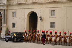 A dozen Swiss Guards in their blue and gold striped uniforms and red-plumed halberds stood at attention in the San Damaso courtyard as Biden and his wife, Jill, arrived. They were received by Monsignor Leonardo Sapienza, who runs the papal household, and then greeted one by one the papal ushers, or papal gentlemen, who lined up in the courtyard.