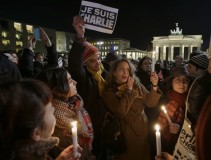 In Los Angeles, a small group gathered outside a French restaurant with people holding up signs and cell phones that read "Je Sui Charlie" and "I am Charlie."