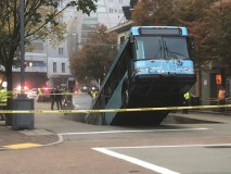 PITTSBURGH (AP) — The front of a city bus is up in the air after a sinkhole opened under it during rush hour in downtown Pittsburgh.