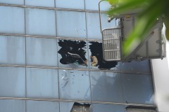 A firefighter breaks glass in an office building that caught fire in Jakarta, Indonesia, Tuesday, Dec. 9, 2025. (AP Photo/Dita Alangkara)   (Associated Press)