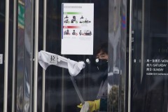 A cleaner wipes the glass door near instructions on hygiene at a clothing apparel store in Beijing, China Tuesday, Feb. 11, 2020. China's daily death toll from a new virus topped 100 for the first time and pushed the total past 1,000 dead, authorities said Tuesday after leader Xi Jinping visited a health...   (Associated Press)