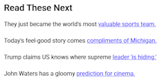 We modified our desktop home page to infinitely scroll without having to click on the "More" button. As you scroll down the page, it will automatically detect when you are near the bottom of what's currently shown in your browser and retrieve more stories for you to view. You can never get enough of Newser!