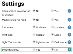 If you are viewing Newser on a touch-enabled device, by default you can swipe left on the story page to navigate to the next story. You can also swipe to the right to go back to the previous page. If you were prefer to turn this setting off, you can now do so on the settings page.